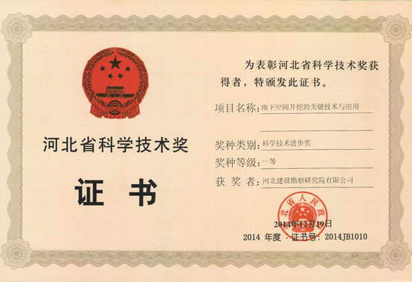 2015年2月26日,省委、省政府在石家莊召開(kāi)全省科技創(chuàng)新暨科學(xué)技術(shù)獎(jiǎng)勵(lì)大會(huì),省委書(shū)記、省人大常委會(huì)主任周本順,省委副書(shū)記、省長(zhǎng)張慶偉出席會(huì)議并講話。會(huì)上,副省長(zhǎng)許寧宣讀了省政府關(guān)于2014年度河北省科學(xué)技術(shù)獎(jiǎng)勵(lì)的決定,公布了獲獎(jiǎng)項(xiàng)目(人員)名單。我公司申報(bào)的項(xiàng)目“地下空間開(kāi)挖的關(guān)鍵技術(shù)與應(yīng)用”榮獲2014年度河北省科學(xué)技術(shù)進(jìn)步獎(jiǎng)一等獎(jiǎng)。
