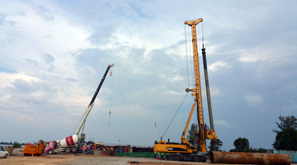 文萊PMB跨海大橋首根試樁鉆孔直徑1.5m,鉆孔深度68.6m,灌注混凝土120方。試樁內(nèi)裝有“荷載箱”兩組,鋼筋應(yīng)力計(jì)52組。通過(guò)技術(shù)攻關(guān),首根試樁的鉆孔垂直度、泥漿參數(shù)、沉渣厚度等指標(biāo)均滿(mǎn)足歐標(biāo)要求,順利通過(guò)總包、監(jiān)理驗(yàn)收。尤其是混凝土灌注施工,有了鉆孔質(zhì)量的保證,混凝土灌注導(dǎo)管自由的在布設(shè)有兩組關(guān)卡的“荷載箱”內(nèi)安放、提拔,獲得了總包方和監(jiān)理方稱(chēng)贊,監(jiān)理工程師向我們豎起了大拇指。我們以一流的管理、先進(jìn)的設(shè)備、精湛的技術(shù),進(jìn)一步擦亮了“河北建勘”品牌。