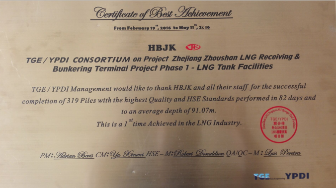 近日我公司收到TGE/YPDI的浙江舟山LNG儲罐接收站項目“最佳成績證書”牌匾,內(nèi)容:TGE/YPDI 管理層對2016年2月19日至2016年5月11日期間河北建勘及其員工以高質(zhì)量和嚴格的HSE管理標準在82天內(nèi)完成319根樁基且平均深度在91.07米的成績表示感謝。