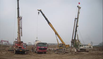 本工程樁基采用后壓漿旋挖鉆孔灌注樁,完成了高效沉降槽、種子過濾、1#、2#、3#、4#焙燒爐、電除塵、平盤過濾、預(yù)脫硅槽、高位槽、種子分解、1#、2#、3#、4#冷卻塔、1#、2#、3#鋁粉倉、棧橋、堿液調(diào)配、提升機(jī)、礦漿槽和蒸發(fā)器、礦漿槽、蒸發(fā)器、冷卻塔、堿液調(diào)配、預(yù)脫硅槽、高位槽。施工主要內(nèi)容包括:測量放線、鋼筋籠制作、運(yùn)輸與吊裝、成孔、混凝土攪拌與運(yùn)輸、水下混凝土灌注、后壓漿、渣土清運(yùn)等。共完成直徑1000mm、800mm和600mm的灌注樁共4501根,樁身混凝土為C25和C30兩種,混凝土設(shè)計方量81773.8m3,實(shí)際灌注方量95288.0m3,平均充盈系數(shù)1.17。