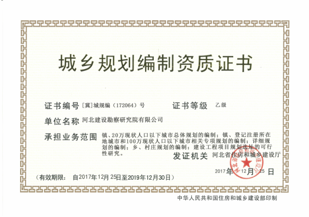 經(jīng)過艱苦努力,我公司于2017年12月25日取得了城鄉(xiāng)規(guī)劃編制乙級資質證書,可承擔20萬現(xiàn)狀人口以下城市總體規(guī)劃的編制,登記注冊所在地城市和100萬現(xiàn)狀人口以下城市相關專項規(guī)劃的編制,以及建設工程項目規(guī)劃選址的可行性研究。