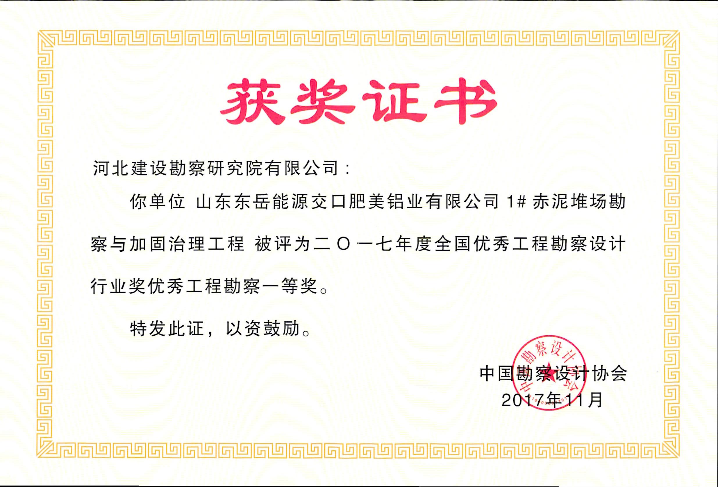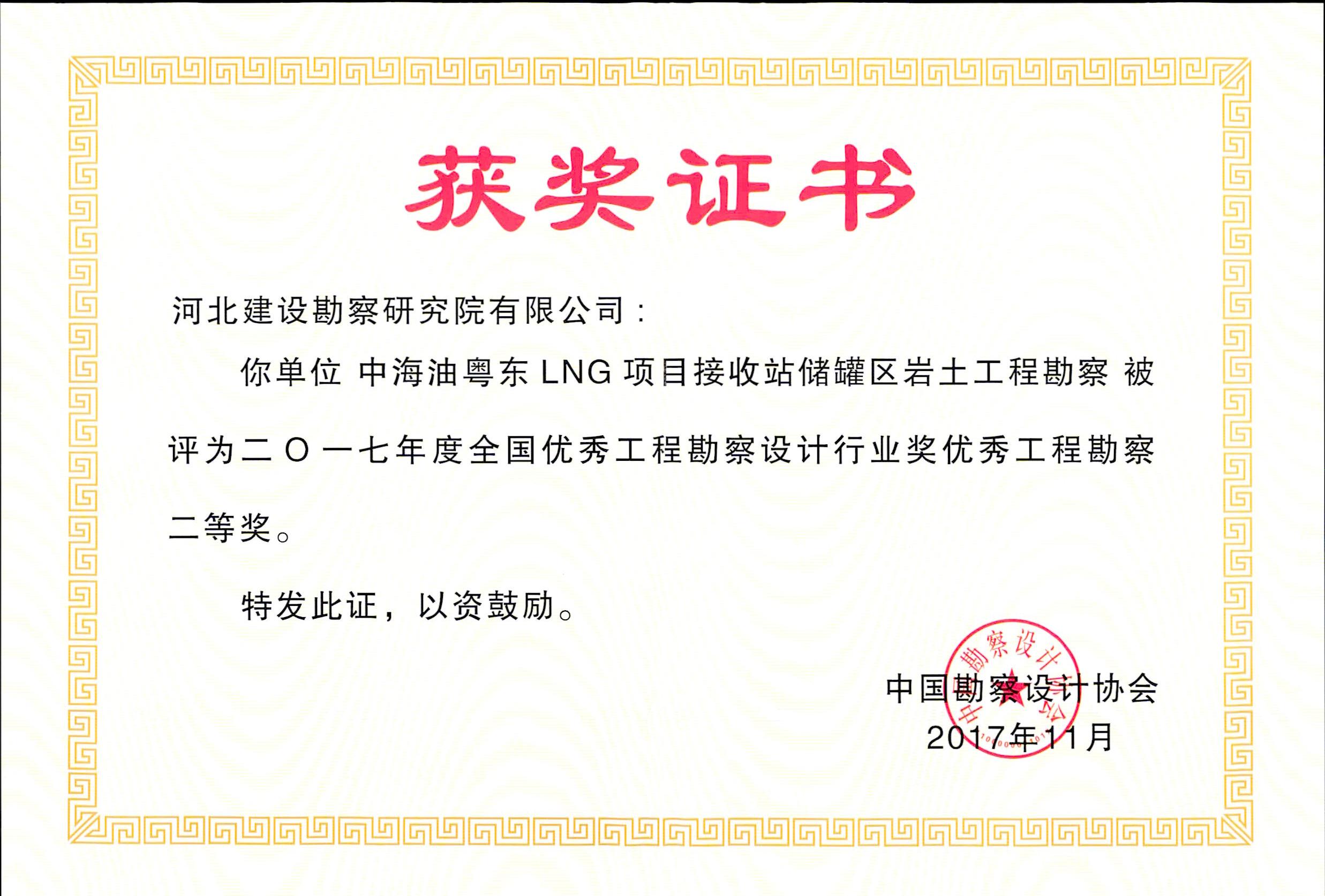 根據(jù)中國勘察設計協(xié)會2017年11月29日發(fā)布的中設協(xié)字【2017】85號文件《關于公布2017年度全國優(yōu)秀工程勘察設計行業(yè)獎評選結果的通知》,我公司兩項工程獲優(yōu)秀工程勘察獎。其中,山東東岳能源交口肥美鋁業(yè)有限公司1#赤泥堆場勘察與加固治理工程榮獲優(yōu)秀工程勘察一等獎,中海油粵東LNG項目接收站儲罐區(qū)巖土工程勘察榮獲優(yōu)秀工程勘察二等獎。