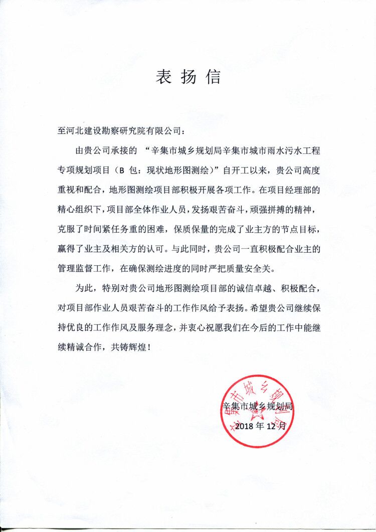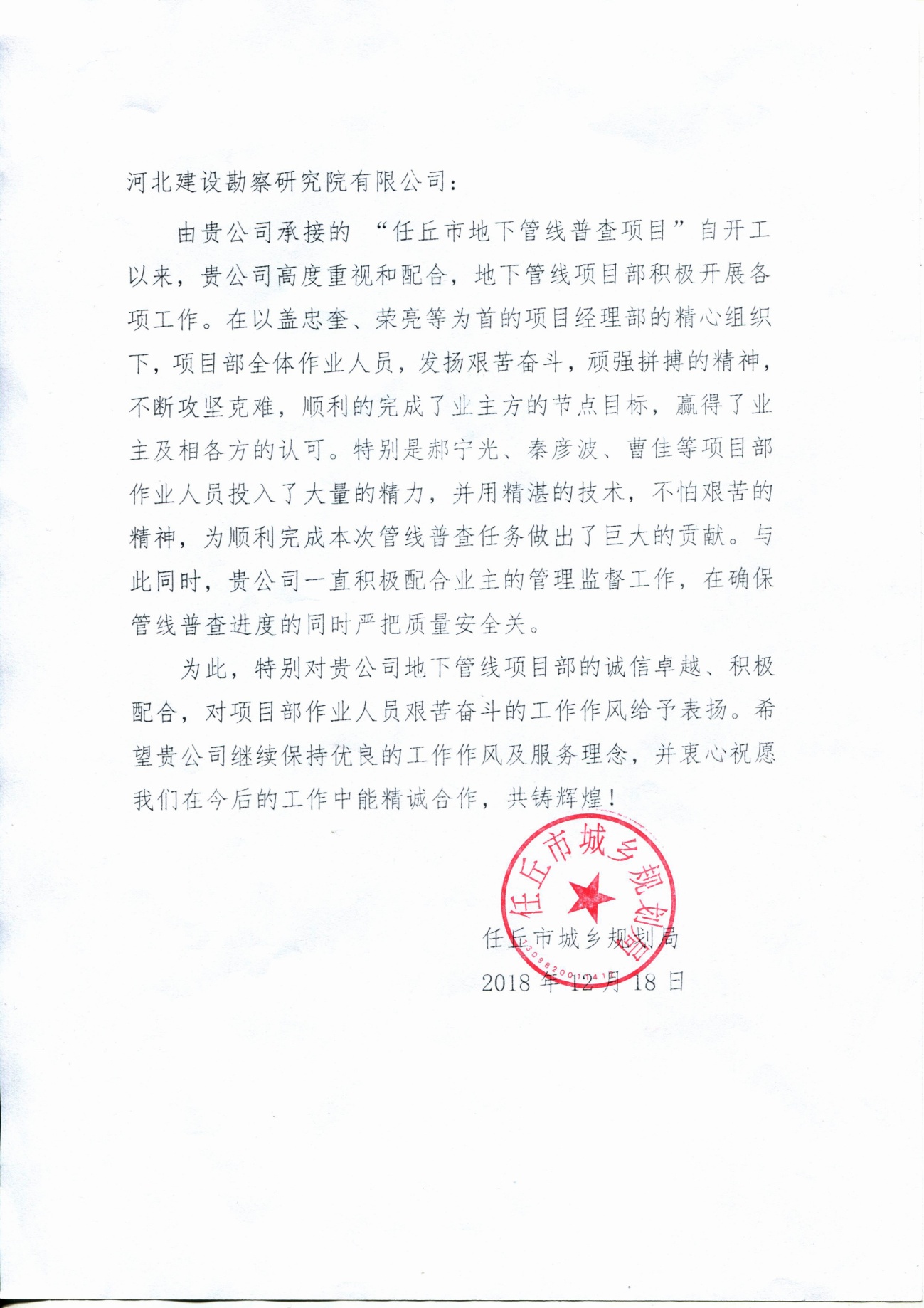 近日,公司收到辛集市城鄉(xiāng)規(guī)劃局和任丘市城鄉(xiāng)規(guī)劃局發(fā)來的表揚信,分別對我公司誠信卓越、積極配合及項目部作業(yè)人員艱苦奮斗的工作作風給予表揚。特別是在任丘地下管線普查項目中,在以蓋忠奎、榮亮為代表的項目部精心組織下,項目全體作業(yè)人員,發(fā)揚艱苦奮斗、頑強拼搏的精神,不斷攻堅克難,保質(zhì)保量提前完成了生產(chǎn)任務(wù),贏得了業(yè)主的認可。甲方特發(fā)來表揚信,對我公司所作出的貢獻表示感謝!并希望我們繼續(xù)保持優(yōu)良的工作作風及服務(wù)理念,精誠合作,共創(chuàng)輝煌!