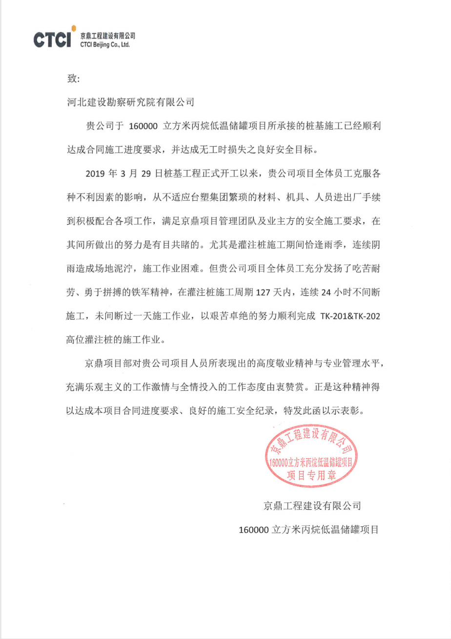 我公司承接的160000立方米丙烷低溫儲罐樁基施工工程,自開工以來,項目部全體員工克服各種不利因素的影響,經(jīng)過艱苦卓絕的不懈努力,已順利達成合同施工進度要求,并達成無工時損失之良好安全目標(biāo),滿足京鼎項目團隊及業(yè)主方的安全施工要求,已圓滿完成各項施工任務(wù),順利完工。期間所表現(xiàn)出的高度敬業(yè)精神和專業(yè)管理水平,得到了業(yè)主和監(jiān)理的一致好評,近期特向我公司發(fā)函予以表揚。