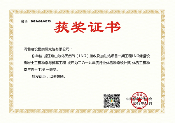 根據(jù)中國勘察設(shè)計(jì)協(xié)會(huì)下發(fā)的文件《關(guān)于公布2019年度工程勘察、建筑設(shè)計(jì)行業(yè)和市政公用工程優(yōu)秀勘察設(shè)計(jì)獎(jiǎng)評(píng)選結(jié)果的通知 》(中設(shè)協(xié)字[2019]136號(hào)),經(jīng)專家評(píng)審、中國勘察設(shè)計(jì)協(xié)會(huì)網(wǎng)站公示和中國勘察設(shè)計(jì)協(xié)會(huì)獎(jiǎng)勵(lì)委員會(huì)審定,公司申報(bào)的項(xiàng)目“浙江舟山液化天然氣(LNG)接收及加注站項(xiàng)目一期工程LNG儲(chǔ)罐設(shè)施巖土工程勘察與樁基工程”榮獲2019年度國家行業(yè)優(yōu)秀勘察設(shè)計(jì)獎(jiǎng)一等獎(jiǎng)、“石家莊市城市軌道交通3號(hào)線一期工程市莊站工程樁試樁工程”榮獲該獎(jiǎng)項(xiàng)三等獎(jiǎng)。此次獲獎(jiǎng)必將激勵(lì)我公司專業(yè)技術(shù)人員繼續(xù)發(fā)揚(yáng)刻苦創(chuàng)新精神,用心做出精品工程,為公司增光添彩!