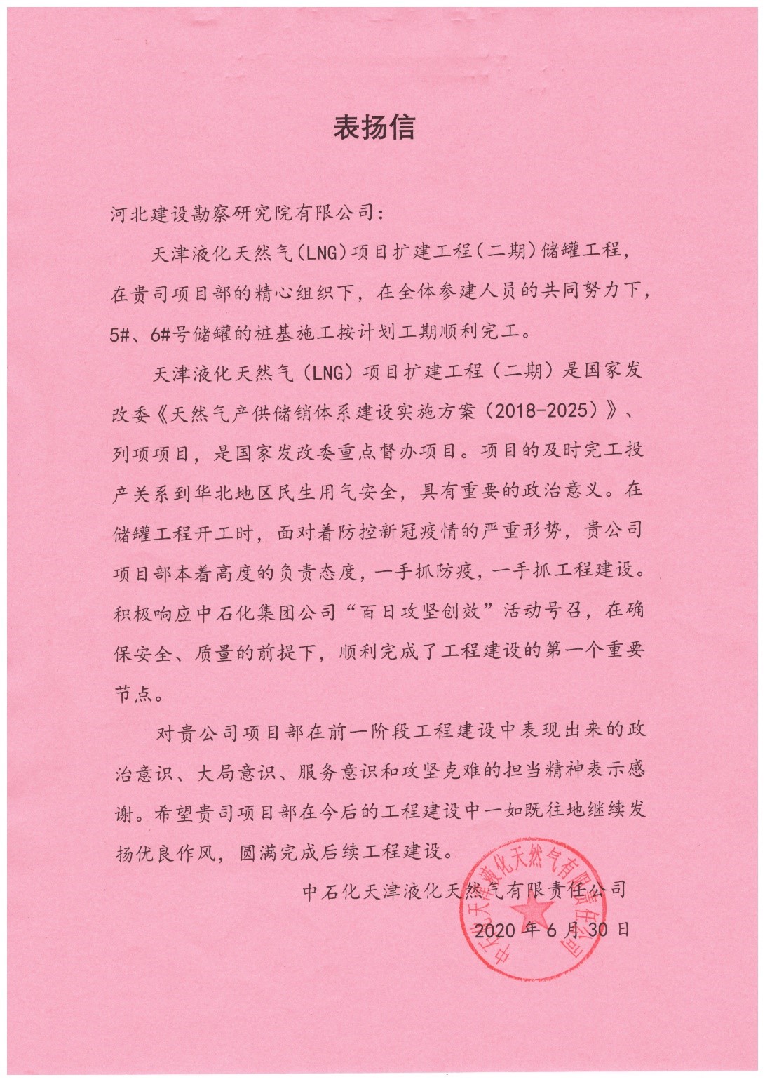 公司承建的天津液化天然氣(LNG)項(xiàng)目擴(kuò)建工程(二期)5#6#罐樁基工程,自2020年4月5日正式開(kāi)工,歷經(jīng)83個(gè)日夜的奮戰(zhàn),最終于2020年6月26日優(yōu)質(zhì)、高效、圓滿(mǎn)的完成了5#6#罐的樁基施工任務(wù)。中石化天津液化天然氣有限責(zé)任公司,對(duì)我公司中石化天津LNG二期項(xiàng)目部提出表?yè)P(yáng),表?yè)P(yáng)我公司領(lǐng)導(dǎo)及全體項(xiàng)目施工人員對(duì)項(xiàng)目高度負(fù)責(zé)的態(tài)度,一手抓防疫,一手抓工程建設(shè),積極響應(yīng)中石化集團(tuán)公司“百日攻堅(jiān)創(chuàng)效”活動(dòng)號(hào)召,在確保安全、質(zhì)量的前提下,順利完成了工程建設(shè)的第一個(gè)重要節(jié)點(diǎn)。同時(shí)對(duì)我公司在前一階段工程建設(shè)中表現(xiàn)出來(lái)的政治意識(shí)、大局意識(shí)、服務(wù)意識(shí)和攻堅(jiān)克難的擔(dān)當(dāng)精神表示感謝。希望我公司在今后的工程建設(shè)中一如既往地繼續(xù)發(fā)揚(yáng)優(yōu)良作風(fēng),圓滿(mǎn)完成后續(xù)工程建設(shè)。