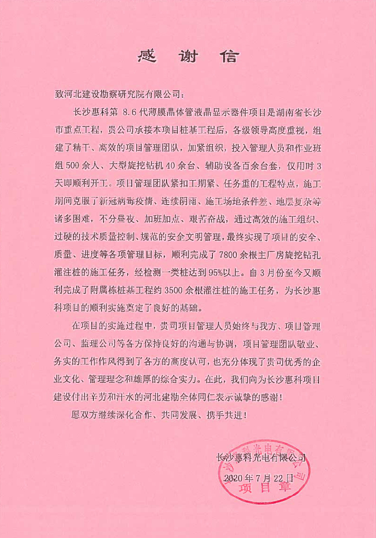 公司承建的長(zhǎng)沙惠科光電有限公司長(zhǎng)沙惠科第8.6代超高清新型顯示器件生產(chǎn)線(xiàn)項(xiàng)目樁基工程,近日收到業(yè)主長(zhǎng)沙惠科光電有限公司的感謝信。感謝信中對(duì)我公司項(xiàng)目管理團(tuán)隊(duì)敬業(yè)、務(wù)實(shí)的工作作風(fēng),以及安全、質(zhì)量管理工作給予了高度的肯定和認(rèn)可。向?yàn)殚L(zhǎng)沙惠科項(xiàng)目建設(shè)付出辛勞和汗水的河北建勘全體同仁表示誠(chéng)摯的感謝!愿雙方繼續(xù)深化合作、共同發(fā)展、攜手共進(jìn)!