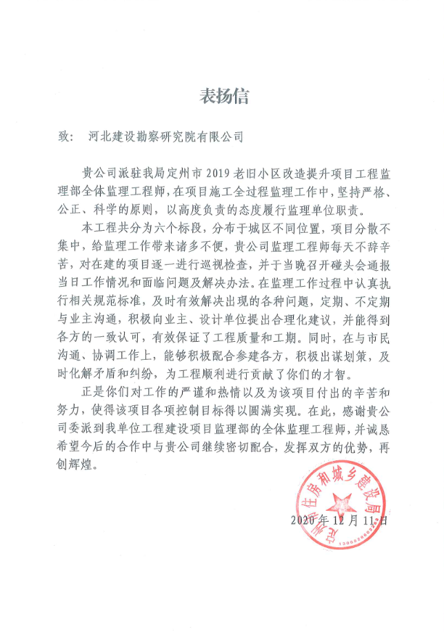 2020年12月我公司收到來自定州市住房和城鄉(xiāng)建設(shè)局關(guān)于定州市2019老舊小區(qū)改造提升項(xiàng)目監(jiān)理工程的表揚(yáng)信,目前該項(xiàng)目已順利竣工驗(yàn)收。雖然該項(xiàng)目要求時(shí)間緊、任務(wù)重,但在監(jiān)理過程中我們公司嚴(yán)格按照相關(guān)規(guī)范、標(biāo)準(zhǔn),科學(xué)管理,嚴(yán)謹(jǐn)認(rèn)真負(fù)責(zé)的工作作風(fēng),保證了該項(xiàng)目按期完工,給各方留下了深刻的印象,不僅得到了定州市住房和城鄉(xiāng)建設(shè)局的高度認(rèn)可和贊譽(yù),還贏得了周邊市民的一致好評,樹立了良好的口碑和信譽(yù),為躋身定州建筑市場更好擴(kuò)展業(yè)務(wù)奠定了基礎(chǔ)。