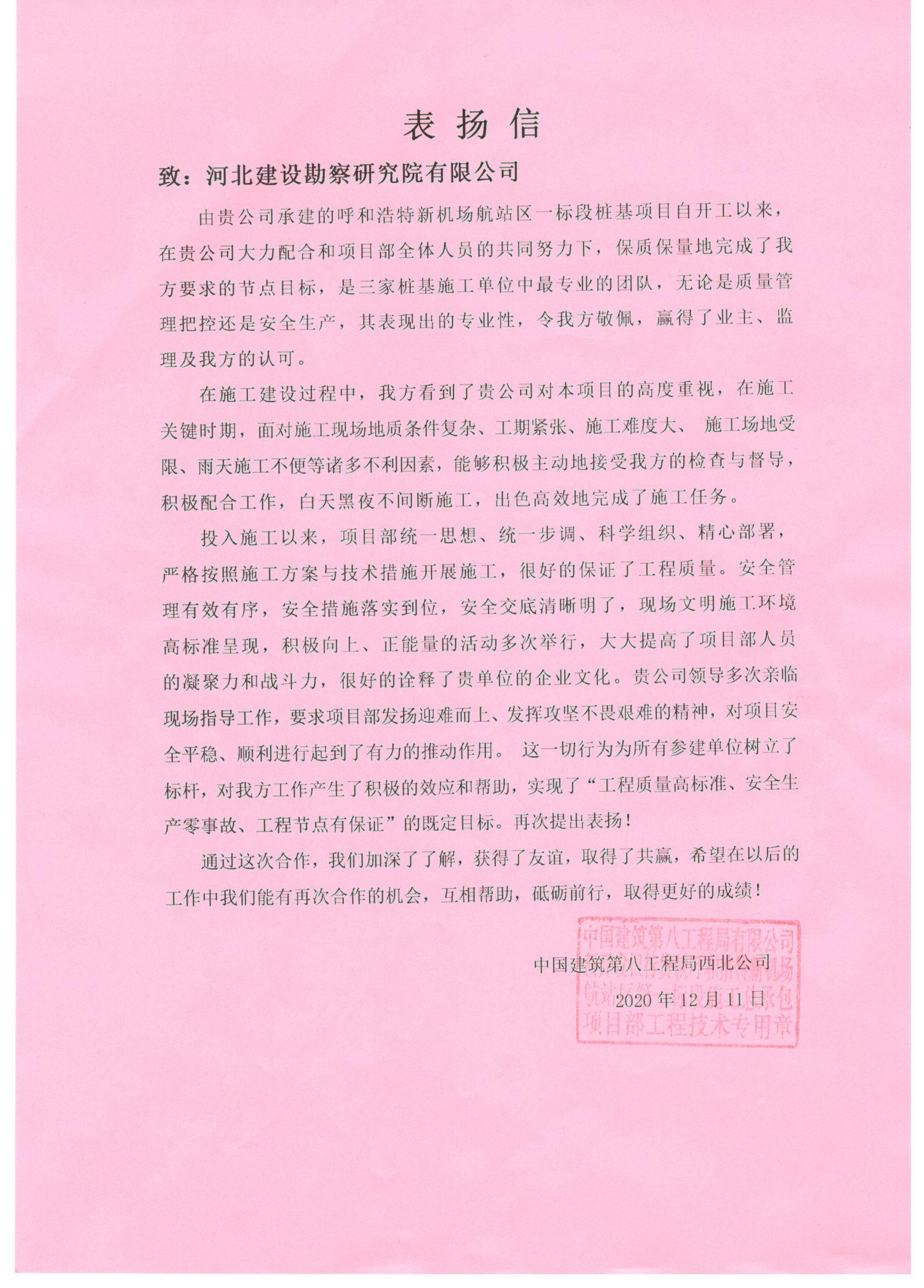近日,公司收到中國化學(xué)賽鼎寧波工程有限公司福建申馬環(huán)己酮項目部、中國建筑第八工程局西北公司呼和浩特新機(jī)場航站區(qū)一標(biāo)段樁基項目部的表揚(yáng)信。