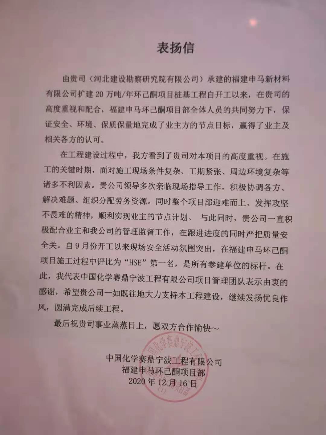 公司收到福建申馬環(huán)己酮項目部和呼和浩特新機(jī)場航站區(qū)一標(biāo)段樁基項目部的表揚(yáng)信