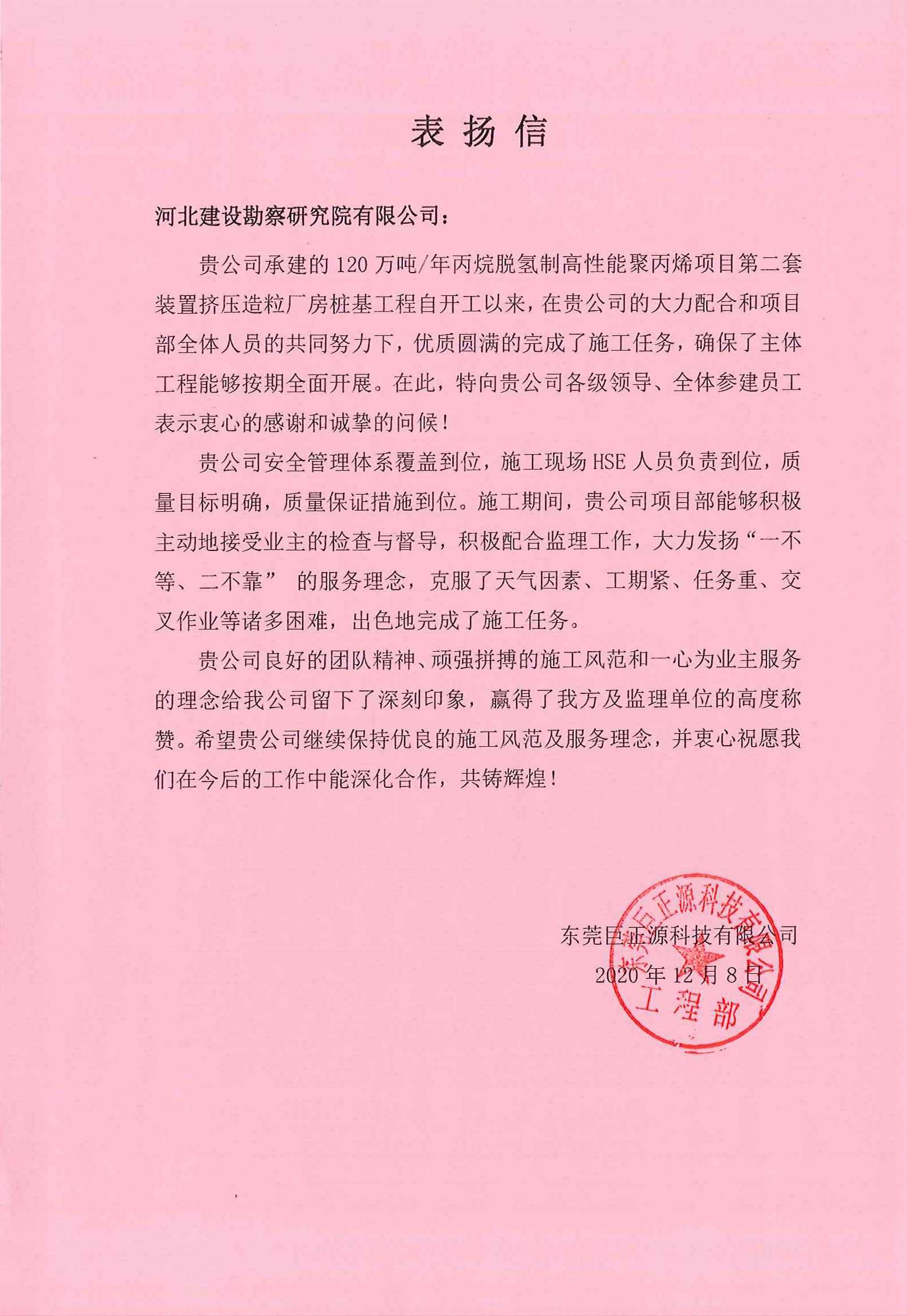 東莞巨正源120萬噸/年丙烷脫氫制高性能聚丙烯項目第二套裝置擠壓造粒廠房樁基工程自開工以來,安全管理體系覆蓋和質(zhì)量保證措施到位,大力發(fā)揚“一不等、二不靠”的服務(wù)理念,克服了工期緊、任務(wù)重、交叉作業(yè)等諸多困難,出色地完成了施工任務(wù)。特向公司各級領(lǐng)導、全體參建員工表示衷心的感謝和誠摯的問候!