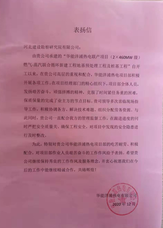 華能洋浦熱電聯(lián)產(chǎn)項目(2×460MW級)燃氣-蒸汽聯(lián)合循環(huán)新建工程地基預處理工程及樁基工程自開工以來,積極開展各項工作,精心組織,克服了時間緊任務(wù)重的困難,保質(zhì)保量完成了節(jié)點目標。特對項目部的吃苦耐勞、積極配合,對項目部作業(yè)人員艱苦奮斗的工作作風給予表揚。