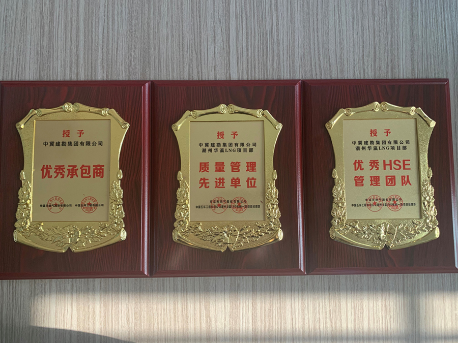 近日,由我公司承建的潮州華瀛液化天然氣接收站項目儲罐工程樁基施工項目,榮獲華瀛天然氣股份有限公司和中國五環(huán)工程有限公司潮州華瀛LNG項目部頒發(fā)的“優(yōu)秀承包商”、“質(zhì)量管理先進單位”和“優(yōu)秀HSE管理團隊”的榮譽獎牌以及感謝信。
