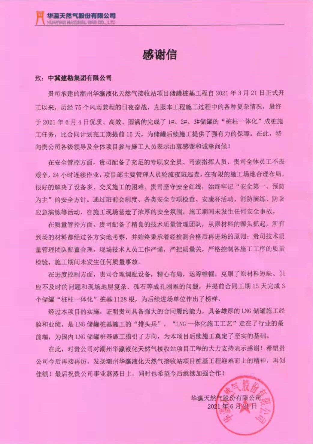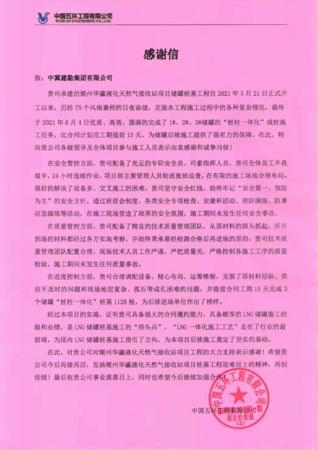 我項目部施工期間正值年初建筑市場復(fù)蘇原材料全面漲價階段,面對現(xiàn)場原材價格不斷上漲且供應(yīng)不足的問題,非常感謝總公司及各位領(lǐng)導(dǎo)的大力支持;面對設(shè)備多、工期緊,任務(wù)重,我公司潮州華瀛LNG項目部,充分發(fā)揚能吃苦、能戰(zhàn)斗的精神,提前謀劃,合理組織、精心安排,積極配合業(yè)主進度計劃,保質(zhì)保量的比合同工期提前15日完成所有樁基施工任務(wù)。我單位在安全管理、施工質(zhì)量管理方面為建設(shè)方、監(jiān)理方、總包方留下深刻影響,為此項目部得到了中國五環(huán)工程有限公司潮州華瀛LNG項目經(jīng)理部以及華瀛天然氣股份有限公司高度認可!