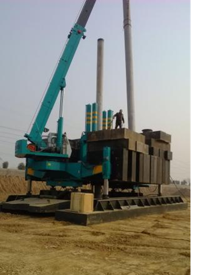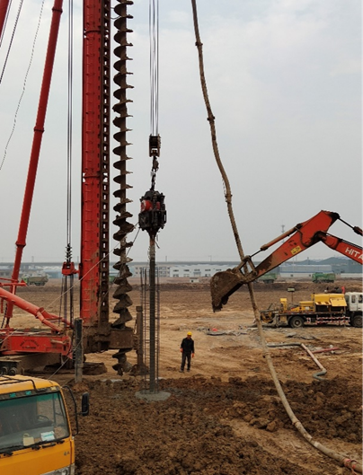 本工程2#、3#廠房樁基成孔采用長螺旋后插筋工藝,混凝土壓灌完成后,進行鋼筋籠安放工作,鋼筋籠安放采用25T吊車和振桿、震動器(采用閉合式鏈接)配合進行。鋼筋籠下入孔中后,保證在孔內(nèi)居中,先由鋼筋籠量與振錘自身的重量讓鋼筋籠自行下沉,當不能自行下沉時(約達到3/1-3/2籠長時),立即開動震錘,邊振動混凝時鋼筋籠邊隨著下沉,鋼筋籠隨著振動下沉至到樁頂標高位置后,采用雙吊筋固定鋼筋籠位置,緩慢將導管從樁身中拔出,并開動震錘,即完成了該樁的施工。當遇見孔口下沉現(xiàn)象時,先用人工清理出表面混凝土,再由鉆機開至孔口進行補方。