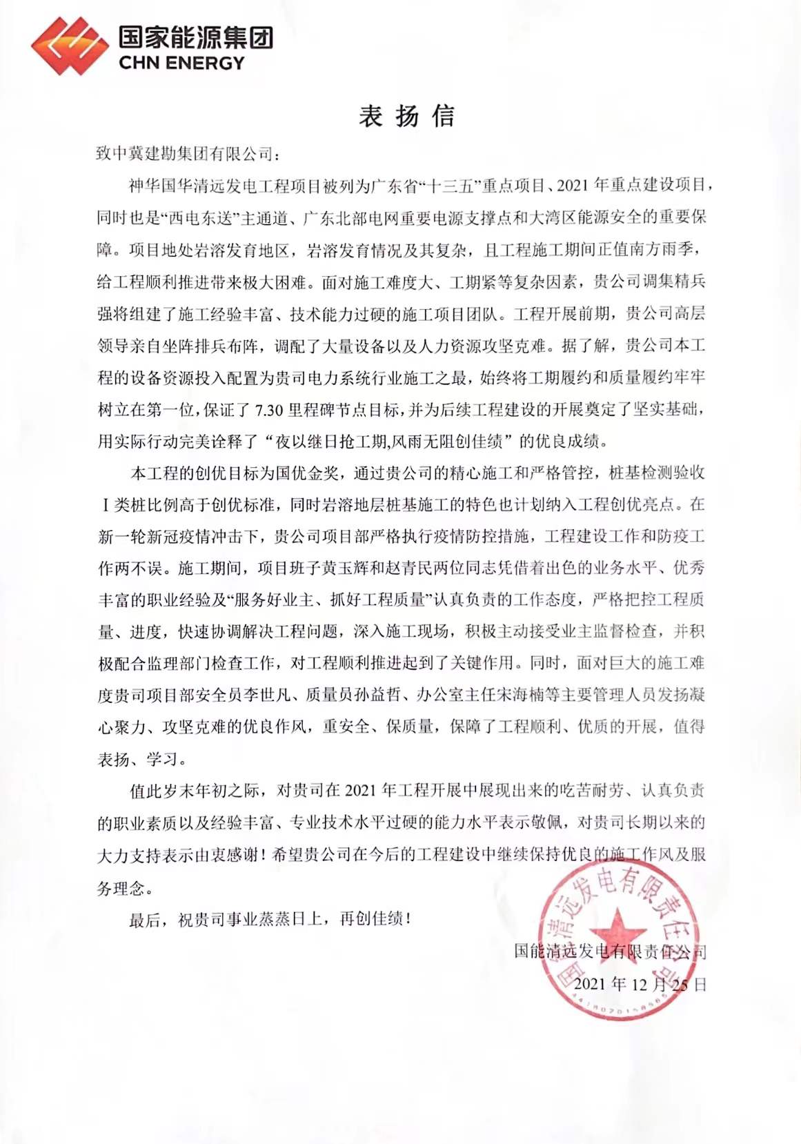 神華國華清遠(yuǎn)發(fā)電工程項(xiàng)目被列為廣東省“十三五”重點(diǎn)項(xiàng)目、2021年重點(diǎn)建設(shè)項(xiàng)目,同時(shí)也是“西電東送”主通道、廣東北部電網(wǎng)重要電源支撐點(diǎn)和大灣區(qū)能源安全的重要保障。我項(xiàng)目在建設(shè)過程中 “夜以繼日搶工期,風(fēng)雨無阻創(chuàng)佳績”的工作效率得到了高度贊揚(yáng)。