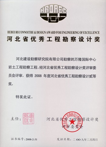 萬隆國際中心巖土工程勘察獲河北省優(yōu)秀工程勘察設(shè)計(jì)二等獎(jiǎng)。