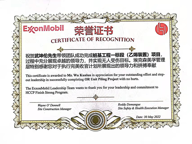 5月30日,??松梨冢ɑ葜荩┗び邢薰菊匍_2022年工作表彰大會(huì),我公司參建的惠州美孚乙烯一期樁基工程項(xiàng)目部,在參建的30余家施工單位中以優(yōu)異的成績,榮獲“優(yōu)秀管理團(tuán)隊(duì)”稱號(hào),生產(chǎn)設(shè)備科科長兼項(xiàng)目經(jīng)理武坤倫榮獲 “卓越領(lǐng)導(dǎo)力”個(gè)人榮譽(yù)證書,項(xiàng)目部每位員工都收到了業(yè)主頒發(fā)的獎(jiǎng)品。