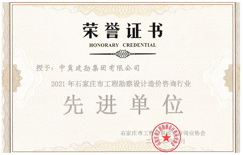 近日,石家莊市工程勘察設計咨詢業(yè)協(xié)會下發(fā)文件《關于表彰2021年石家莊市工程勘察設計造價咨詢行業(yè)先進單位和先進個人的通知》(石設協(xié)字【2022】6號),我公司被授予“2021年石家莊市工程勘察設計造價咨詢行業(yè)先進單位”稱號,韓立君同志、商衛(wèi)東同志被授予“2021年石家莊市工程勘察設計造價咨詢行業(yè)先進個人”稱號。此榮譽的獲得說明了公司在貫徹高質(zhì)量發(fā)展戰(zhàn)略方面取得了良好業(yè)績,為推動我市勘察設計行業(yè)高質(zhì)量發(fā)展做出了積極貢獻,得到了行業(yè)的肯定和認可。