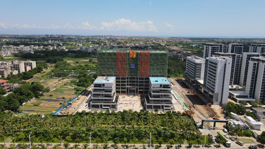 海南辦公樓占地面積15畝,地下二層,地上12層,總建筑面積47527平方米。工程自2021年9月13日現(xiàn)場舉辦開工儀式以來,經(jīng)過11個月的合力攻堅,克服高溫、臺風、疫情等重重難關,如期實現(xiàn)了一個個關鍵節(jié)點:2021年10月25日第一根基礎工程樁混凝土灌注順利完成;2021年12月4日開始8萬方土方開挖的任務;2022年1月29日,實現(xiàn)了基礎筏板的澆筑;2022年4月10日,完成了地下二層車庫施工,主體如期“沖”出正負零;2022年6月24日,東、西配樓主體按計劃日期封頂。如今項目迎來了主體封頂?shù)睦锍瘫?,為后期工程樹立了標桿!
