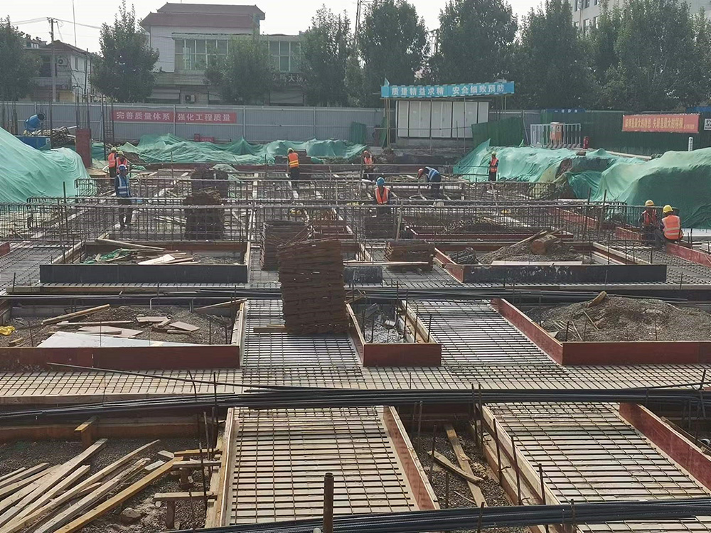 本工程特點(diǎn)如下:①施工場(chǎng)地小,施工材料堆放集中,二次搬運(yùn)多;②施工過(guò)程中勞動(dòng)力集中,各專(zhuān)業(yè)穿插作業(yè)多,其中基礎(chǔ)施工時(shí)需3天內(nèi)組織接近200人同時(shí)施工,在新冠疫情影響下組織如此規(guī)模人員短時(shí)間進(jìn)場(chǎng)難度較大;③技術(shù)重點(diǎn)多,項(xiàng)目部經(jīng)過(guò)科學(xué)嚴(yán)密的組織和監(jiān)管成功的把控了各個(gè)施工環(huán)節(jié)質(zhì)量,保證工程達(dá)到驗(yàn)收標(biāo)準(zhǔn)。