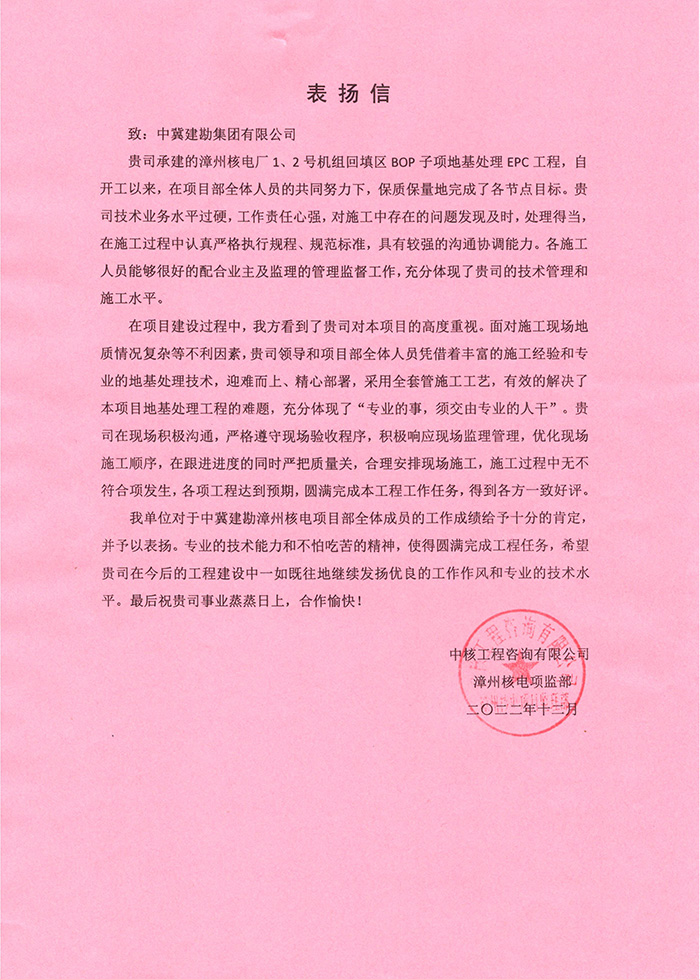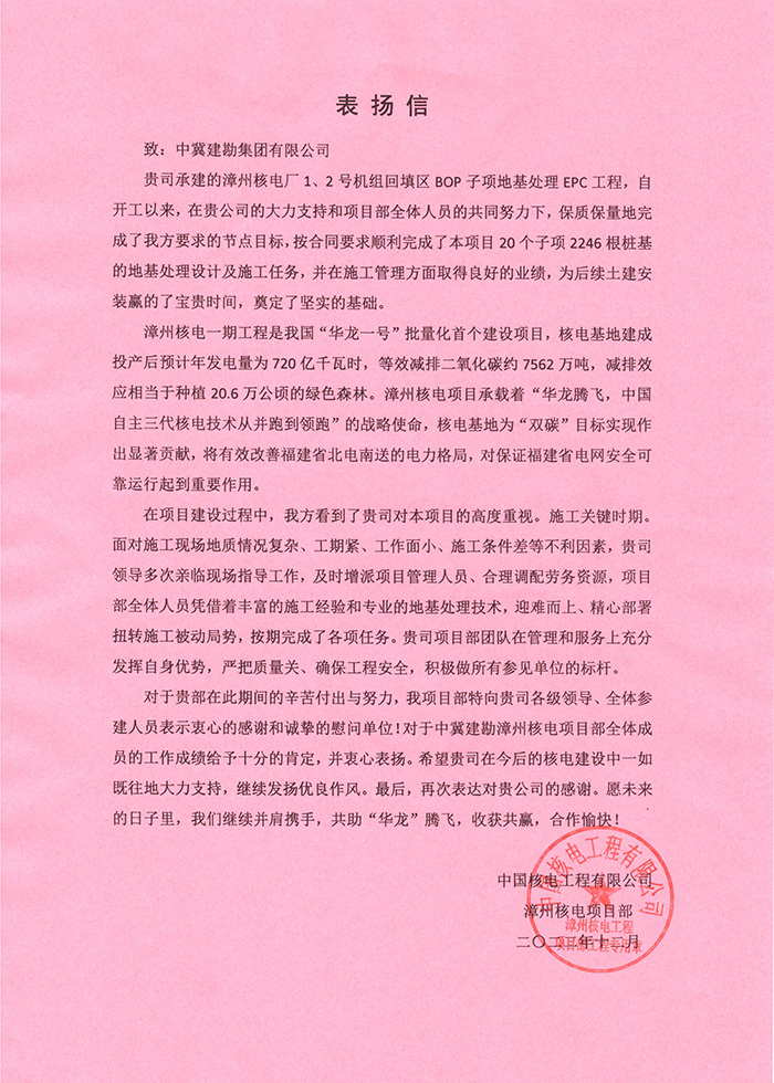 漳州核電一期工程是我國“華龍一號”批量化首個建設項目,承載著“華龍騰飛,中國自主三代核電技術從并跑到領跑”的戰(zhàn)略使命,核電基地為“雙碳”目標實現作出顯著貢獻,是國家核電建設的重點項目。在工程建設過程中面對規(guī)模較大、場地分散、交叉施工等多項不利因素,項目部迎難而上、精心部署、晝夜施工,確保安全、質量的情況下按期完成了各項任務。項目部在谷習光同志的帶領下,在管理和服務上充分發(fā)揮自身優(yōu)勢,積極爭當所有參見單位的標桿,得到了甲方和監(jiān)理的高度贊揚,為以后更多的合作奠定了堅實基礎。