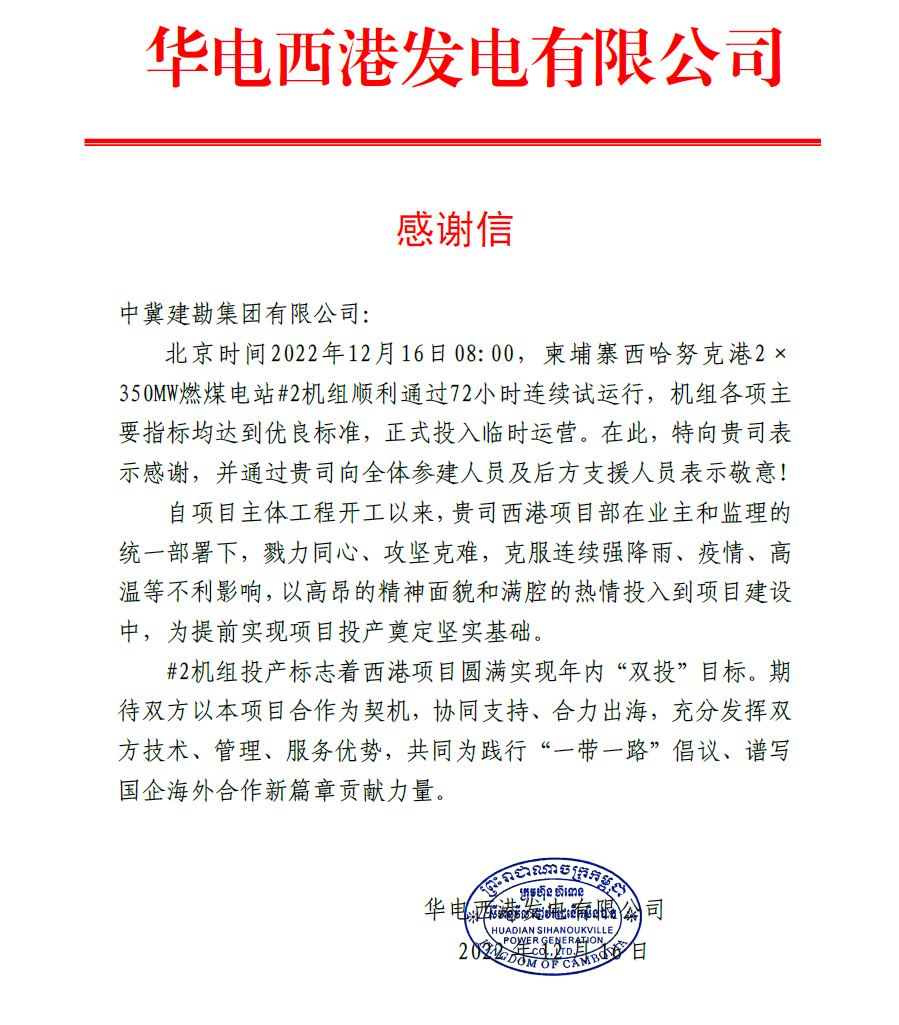 柬埔寨西哈努克港2×350MW燃煤電站#1機組順利通過柬埔寨國家電力公司要求的滿負荷性能試驗,標志著中國華電在柬投資興建的最大火電項目首臺機組正式投產發(fā)電。自該項目主體工程開工以來,西港項目部全體人員在業(yè)主和監(jiān)理的統(tǒng)一部署下,勠力同心、攻堅克難,克服連續(xù)降雨、疫情、高溫等不利影響,以高昂的精神面貌和滿腔的熱情投入到項目建設中,為項目提前實現#1機組投產奠定堅實基礎。