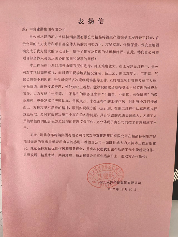 河北永洋特鋼集團有限公司精品特鋼生產線樁基工程自開工以來,在項目部全體人員的共同努力下,攻堅克難,保質保量保安全地圓滿完成了業(yè)主要求的節(jié)點目標,大力發(fā)揚“一不等、二不靠”的服務理念和“不怕苦、不怕累、頑強拼搏”的敬業(yè)精神,贏得了業(yè)主及監(jiān)理的認可和好評。