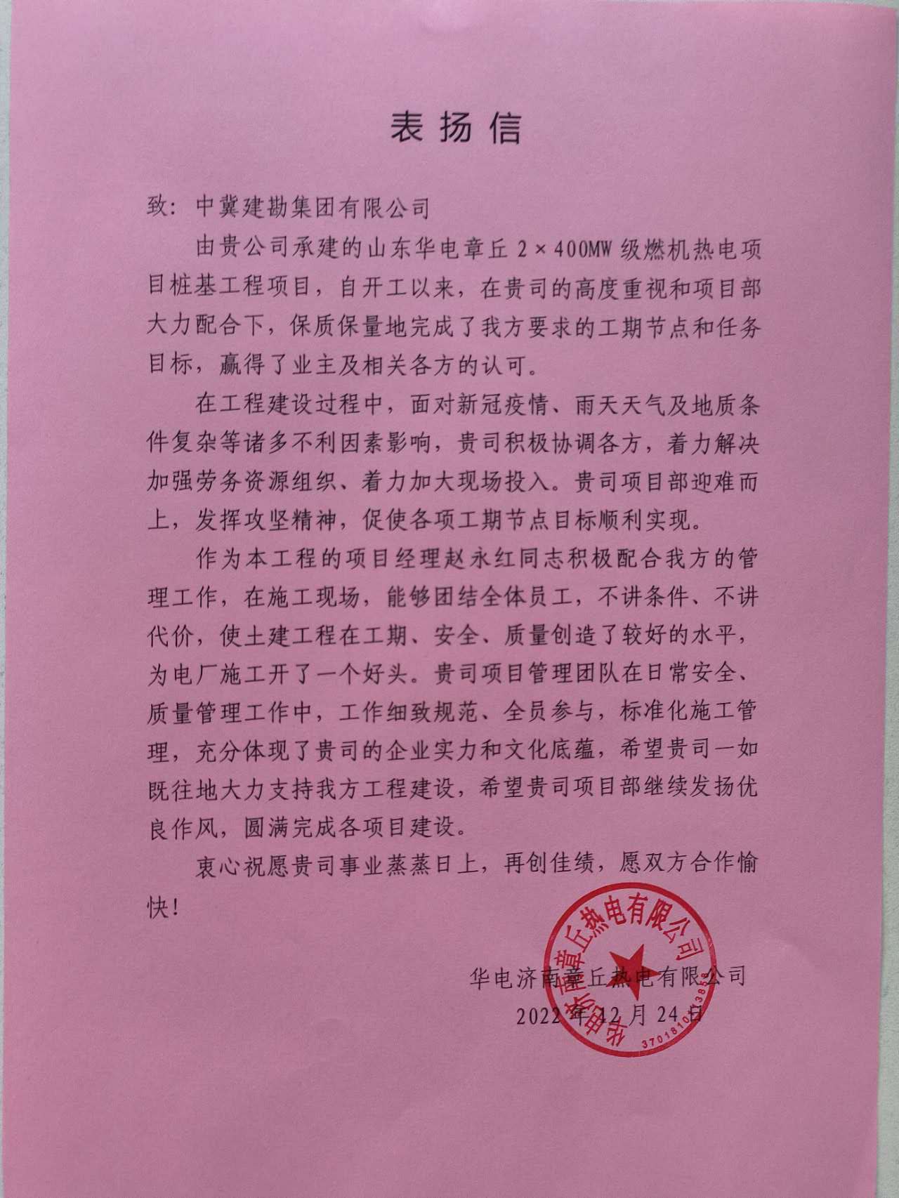 山東華電章丘2×400MW級燃機熱電項目樁基工程,在工程建設過程中,面對新冠疫情、雨天天氣及地質條件復雜等諸多不利影響,在項目經理趙永紅同志的帶領下,能夠團結一致,不講條件,使土建工程在工期、安全、質量創(chuàng)造了較好的水平,為電廠施工開了一個好頭。項目管理團隊在日常安全、質量管理工作中,工作細致規(guī)范、標準化施工管理,充分體現了我公司的企業(yè)實力和文化底蘊。