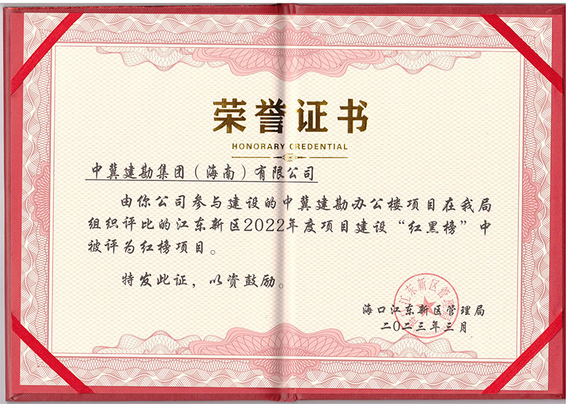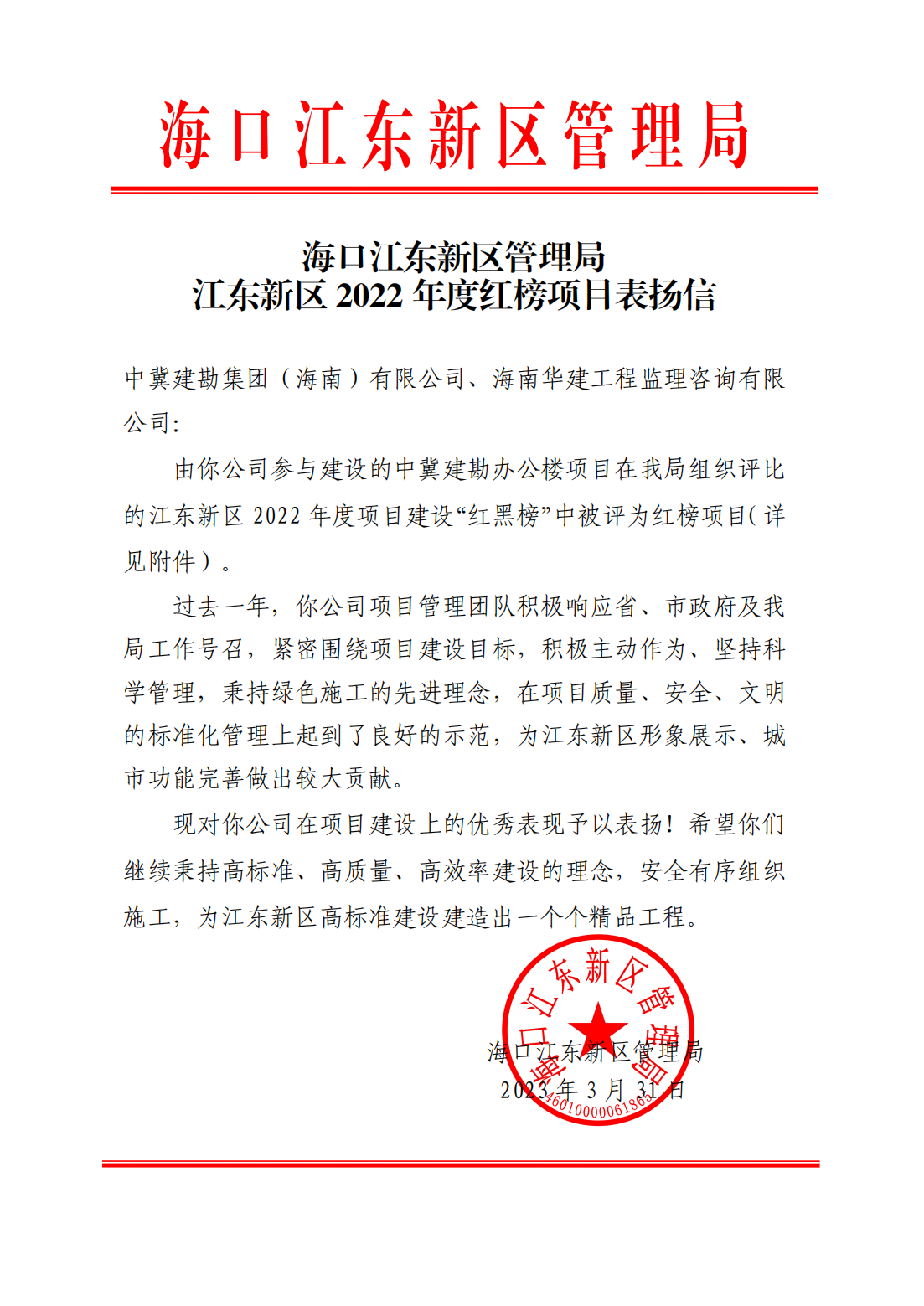 人勤春來(lái)早,實(shí)干正當(dāng)時(shí)。2023年3月31日,為促進(jìn)項(xiàng)目建設(shè)進(jìn)度,營(yíng)造“安全、文明、有序”的建設(shè)氛圍,??诮瓥|新區(qū)管理局公布了2022年度項(xiàng)目建設(shè)“紅黑榜”,“中冀建勘辦公樓”項(xiàng)目再次受到表彰,并為項(xiàng)目頒發(fā)了榮譽(yù)證書。