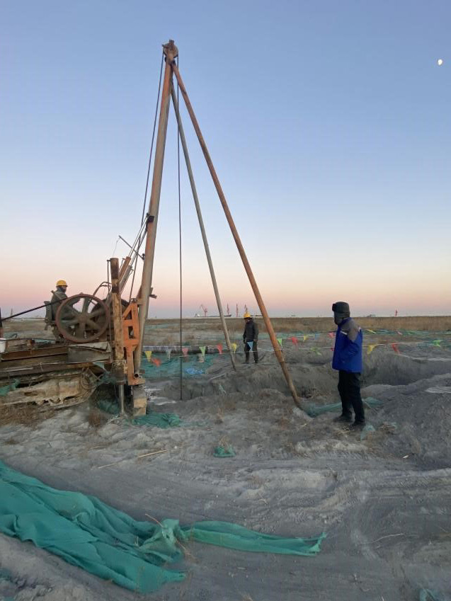 本工程施工場(chǎng)地為超厚層回填粉煤灰,處理難度大,國內(nèi)沒有類似工程經(jīng)驗(yàn);施工場(chǎng)地大需要投入更多人員和設(shè)備進(jìn)行施工和管理;因緊靠渤海,地下水豐富,為保障降水效果需投入更多資源;季節(jié)性影響,冬季低溫對(duì)施工造成一定難度。針對(duì)以上工程特點(diǎn),我公司項(xiàng)目部經(jīng)過科學(xué)嚴(yán)密的組織和管理,克服各種困難,使工程地質(zhì)條件得到很大的改善。