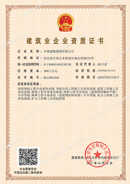 集團(tuán)公司于2023年8月24日喜獲電力工程施工總承包貳級(jí)資質(zhì),該資質(zhì)的取得將大力促進(jìn)我公司在電力能源市場(chǎng)的業(yè)務(wù)拓展能力,由電力項(xiàng)目的地基基礎(chǔ)專業(yè)承包向土建、安裝總成承包邁進(jìn),為獨(dú)立承接風(fēng)電、光電等電力新能源項(xiàng)目提供了準(zhǔn)入證。