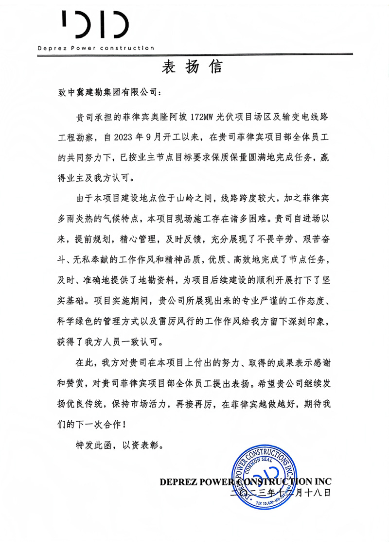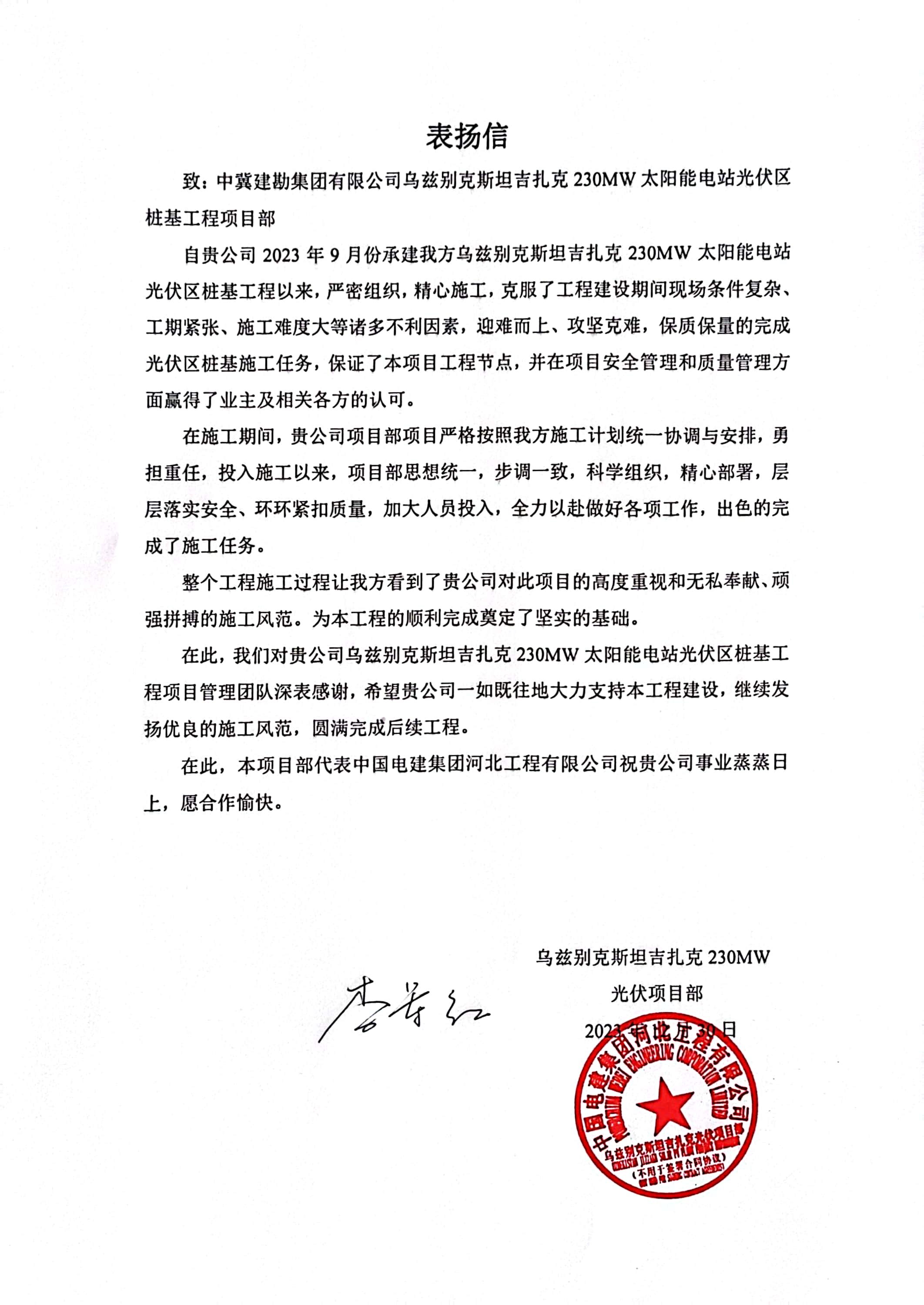 中國電建集團(tuán)河北工程有限公司發(fā)來的表揚(yáng)信,對在烏茲別克斯坦吉扎克230MW太陽能電站光伏項目施工期間,項目部思想統(tǒng)一,科學(xué)組織,精心部署,層層落實安全、環(huán)環(huán)緊扣質(zhì)量,全力以赴做好各項工作的奮斗精神,給予了高度評價和感謝。