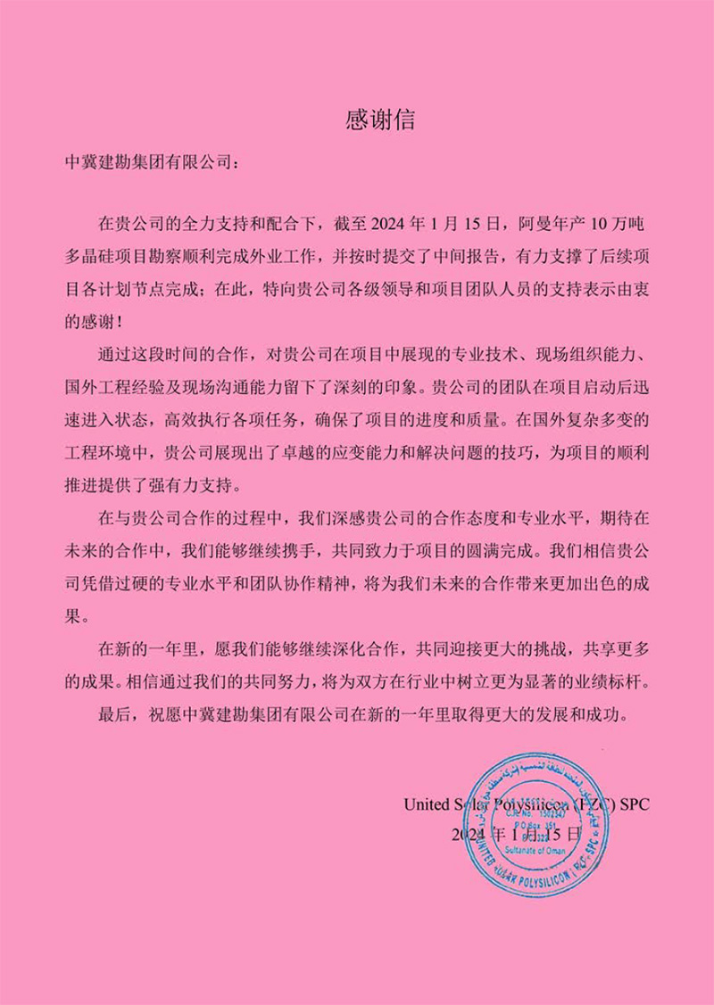 近日,集團(tuán)公司陸續(xù)收到國內(nèi)外項目業(yè)主發(fā)來的表揚(yáng)信,信中對我公司的項目管理、團(tuán)隊建設(shè)、安全文明施工、技術(shù)質(zhì)量管控等,給予了高度評價,同時送上了新年一年的祝福。