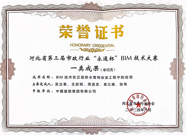 近日,河北省市政行業(yè)協(xié)會發(fā)文《關(guān)于公布河北省第三屆市政行業(yè)“永通杯”BIM技術(shù)大賽結(jié)果的通知》(冀市協(xié)〔2024〕21號),我公司參賽項目“BIM 技術(shù)在正定排水管網(wǎng)改造工程中的應用”項目榮獲一類成果。