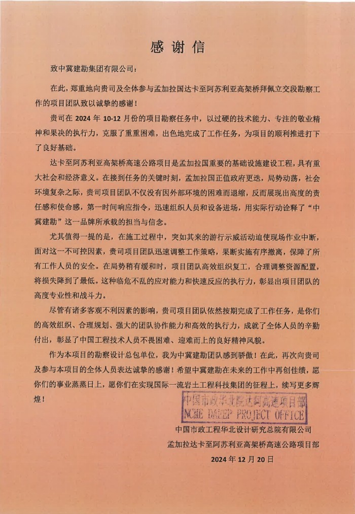 孟加拉達(dá)卡至阿蘇利亞高架橋高速公路項(xiàng)目部向我公司發(fā)來(lái)了感謝信,感謝我公司在項(xiàng)目勘察期間展現(xiàn)的高度專(zhuān)業(yè)精神和卓越執(zhí)行力。尤其在復(fù)雜的社會(huì)環(huán)境和突如其來(lái)的示威活動(dòng)中,我公司項(xiàng)目團(tuán)隊(duì)臨危不亂,迅速調(diào)整工作策略,保障了項(xiàng)目的順利推進(jìn)和人員的安全。