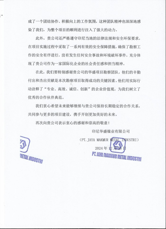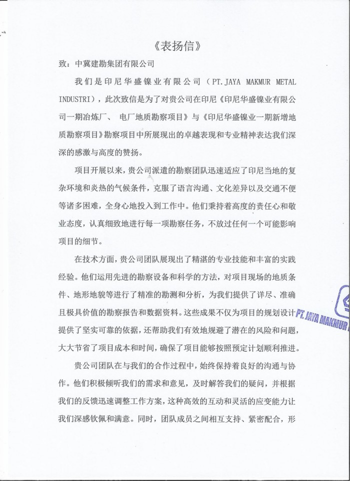 印尼華盛鎳業(yè)有限公司發(fā)來(lái)了表?yè)P(yáng)信。在印尼華盛鎳業(yè)有限公司一期冶煉廠(chǎng)、電廠(chǎng)地質(zhì)勘察項(xiàng)目及印尼華盛-年產(chǎn)200萬(wàn)噸綜合鋼鐵項(xiàng)目的勘察任務(wù)中,印尼華盛勘察項(xiàng)目部全體職工迅速適應(yīng)印尼當(dāng)?shù)氐膹?fù)雜環(huán)境和炎熱的氣候條件,克服了語(yǔ)言溝通、文化差異以及交通不便等諸多困難,全身心地投入到工作中。在項(xiàng)目實(shí)施過(guò)程中,嚴(yán)格遵守印尼當(dāng)?shù)氐姆煞ㄒ?guī)和安全環(huán)保要求,采取了一系列有效的安全保障措施,確保了勘察工作的安全有序進(jìn)行。這種高度的專(zhuān)業(yè)素養(yǎng)和社會(huì)責(zé)任感,贏得了業(yè)主方的高度贊揚(yáng)和深深感激。