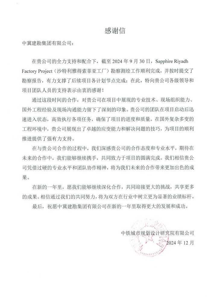 中鐵城市規(guī)劃設(shè)計(jì)研究院有限公司發(fā)來(lái)表?yè)P(yáng)信,對(duì)在我公司全力支持和配合下,順利完成沙特利亞德索菲亞工廠(chǎng)勘察測(cè)繪工作,并按時(shí)提交了勘察報(bào)告,有力支撐了后續(xù)項(xiàng)目各計(jì)劃節(jié)點(diǎn)完成,向我公司及項(xiàng)目團(tuán)隊(duì)表示由衷感謝。