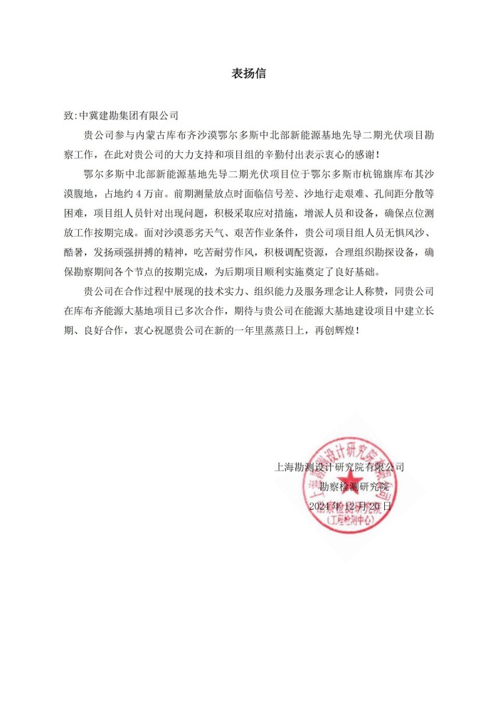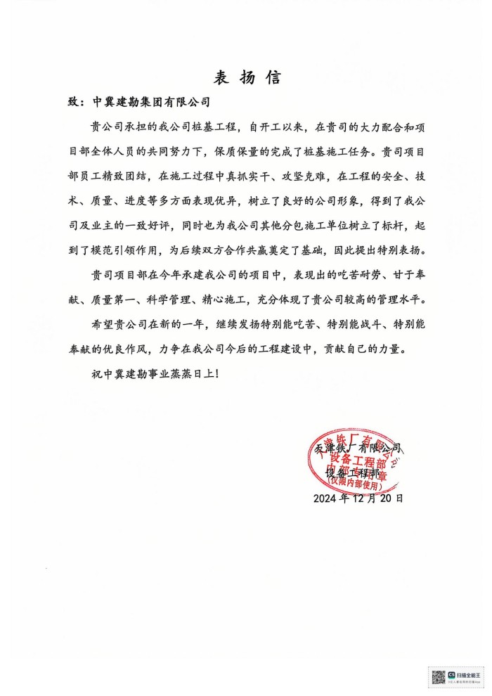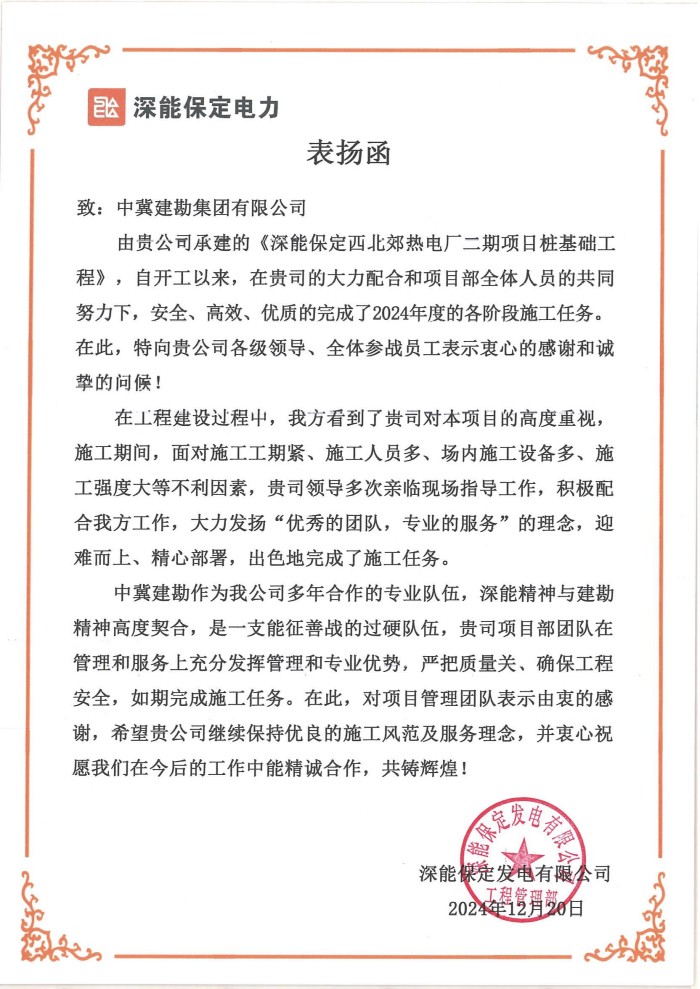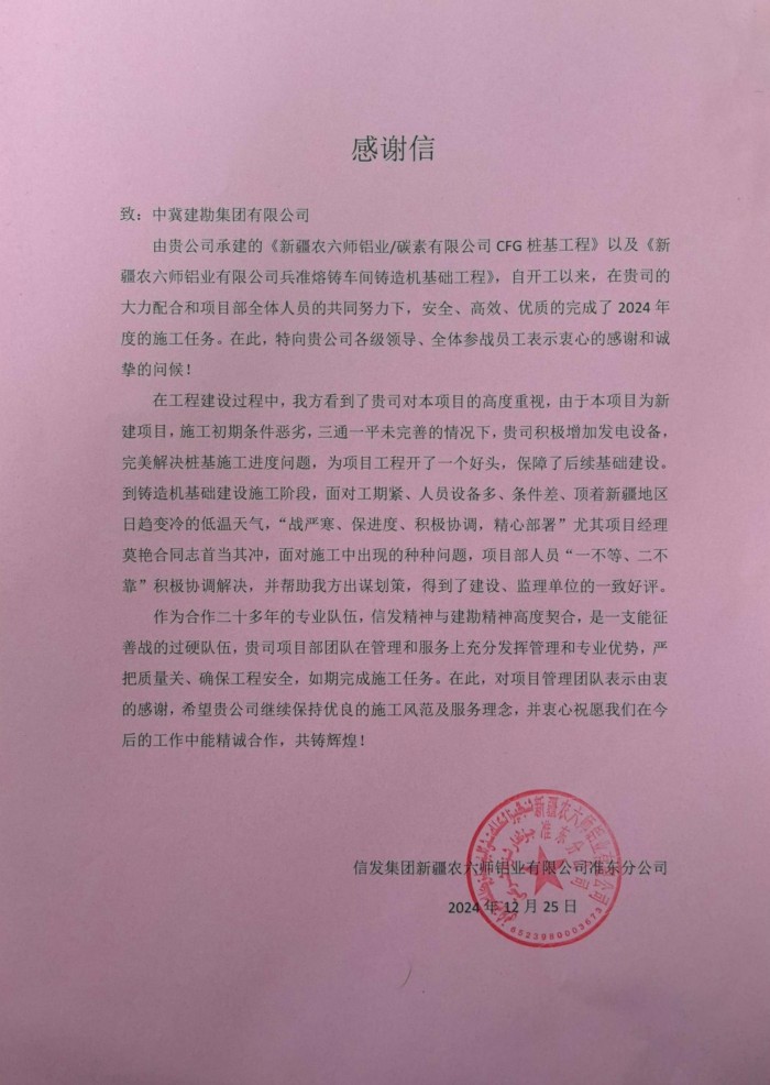 此外,我公司參與的新疆農(nóng)六師鋁業(yè)CFG樁項(xiàng)目、內(nèi)蒙古庫(kù)布齊沙漠鄂爾多斯中北部新能源基地光伏項(xiàng)目、深能保定西北郊熱電廠(chǎng)樁基礎(chǔ)工程等多個(gè)國(guó)內(nèi)外項(xiàng)目收到業(yè)主單位表?yè)P(yáng)信,對(duì)我公司在項(xiàng)目中的高效執(zhí)行、嚴(yán)謹(jǐn)管理和出色的團(tuán)隊(duì)協(xié)作表示衷心感謝,并希望未來(lái)繼續(xù)與我公司保持緊密合作。