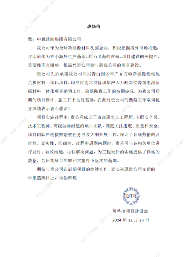 近日,公司收到了來(lái)自多方業(yè)主單位的感謝信及表?yè)P(yáng)信,表彰公司在孟加拉、印尼、沙特及國(guó)內(nèi)多個(gè)重要項(xiàng)目中,展現(xiàn)出的卓越項(xiàng)目管理能力、技術(shù)實(shí)力、團(tuán)隊(duì)協(xié)作及不懈努力。各業(yè)主單位對(duì)公司在工程勘察、施工管理、技術(shù)方案執(zhí)行、質(zhì)量控制和安全生產(chǎn)等方面給予了較高認(rèn)可,并送上了誠(chéng)摯的祝福。
