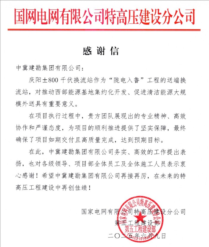 2025年6月9日,在±800千伏隴東-山東特高壓直流工程(簡稱“隴電入魯”)正式投運(yùn)之際,我公司收到國家電網(wǎng)有限公司特高壓建設(shè)分公司對慶陽±800千伏換流站項(xiàng)目發(fā)來的感謝信。信中高度贊揚(yáng)了我公司在項(xiàng)目執(zhí)行過程中展現(xiàn)出的卓越專業(yè)精神、高效協(xié)作能力和嚴(yán)謹(jǐn)工作態(tài)度。