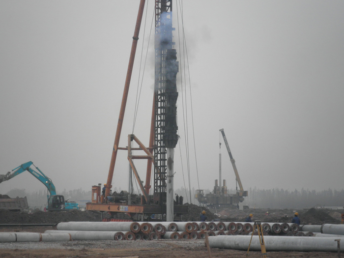 本工程我公司共完成樁徑Φ400mm、樁長(zhǎng)18~27m的PHC管樁601根,共計(jì)約14976延米;樁徑Φ500mm、樁長(zhǎng)23~32m的PHC管樁826根,共計(jì)約22039延米;樁徑Φ400mm、樁長(zhǎng)15.6~21.6m的CFG樁537根,理論方量1360m3,實(shí)際方量為2029m3。