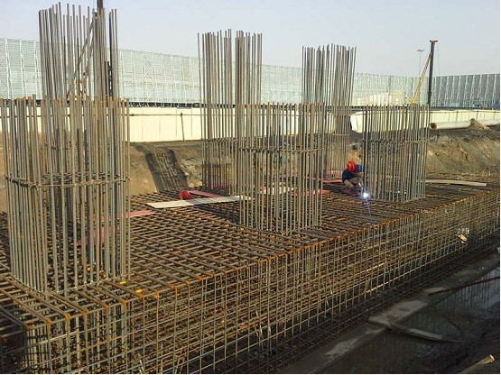 本項目共完成預應力混凝土管樁432根,單根樁長44m,總計19008m。土建工程完成鋼筋加工469.608噸,澆筑混凝土5148.5 m3,安裝地腳螺栓672個,鋼結構預埋件79.383噸,防雷接地網727米。土方開挖7452.92m3;土方回填1675.39m3;土方外運5777.53m3;碎石回填1841.5m3;磚砌墻79.95m3;抹灰716.86m3;設置沉降觀測點20個。